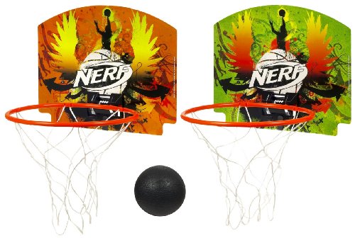 Spin, jump and drop the rock anywhere you want! Create a full-court basketball experience between any two walls with this complete basketball set. Attach the peel-and-stick backboards to almost any wall and you're ready to play head-to-head NERF-style basketball against a friend or a team! Get ready to allyoop like the pros from the comfort of your favorite room! Set includes 2 hoops and nets, 2 backboards and a NERF Mini Basketball. Ages 4 and up.